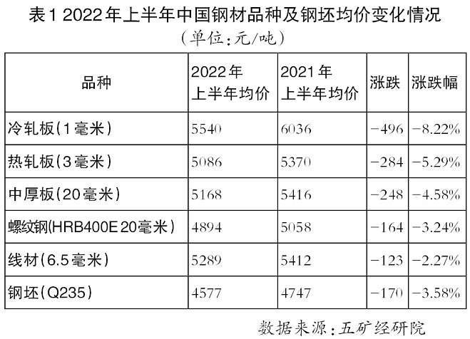 上半年,受不斷反復的新冠肺炎疫情影響,我國消費需求下降,我國鋼材下游消費市場整體弱行。截至6月30日,我國五大類鋼材品種以及鋼坯價格震蕩下行,最新價格已經基本下降至2020年末的價格水平。據(jù)中國鋼鐵工業(yè)協(xié)會統(tǒng)計,截至6月30日,我國鋼材品種中,冷軋類鋼材價格同比降幅最大,超過8%;線材類鋼材價格同比降幅最小,只略高于2%(見表1)。