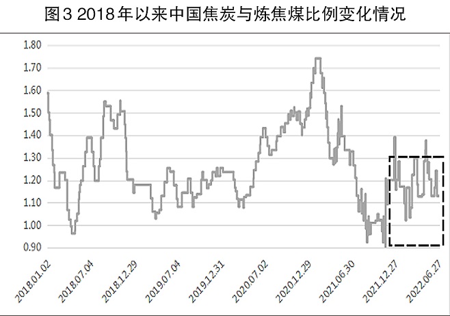 從焦煤與焦炭的用量轉換比上看(見圖3),2022年上半年,我國煉焦行業(yè)焦煤比僅為1.18,遠低于1.3的行業(yè)標準。由于煉焦煤價格始終高企且漲幅超過焦炭,焦炭企業(yè)始終處于虧損或瀕臨虧損的狀態(tài)。據(jù)局部市場調研,目前國內部分中小焦企已經停產。