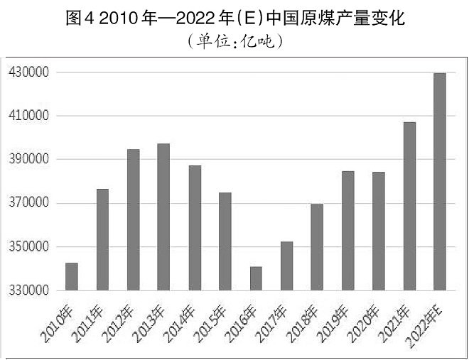 能源保供穩(wěn)價政策使得煤炭產量自2021年起或連續(xù)兩年創(chuàng)新高。自“十二五”以來,煤炭行業(yè)供給側結構性改革不斷深入,加之2018年后,我國環(huán)保政策日趨嚴格,導致煤炭產量受到較大限制。國家統(tǒng)計局數(shù)據(jù)顯示(見圖4),2010年我國煤炭產量為34.3億噸,2013年達到39.7億噸,2016年下降至34.1億噸,2020年恢復至38.4億噸。2021年以全球突發(fā)能源危機為背景,在國家能源保供穩(wěn)價的政策導引下,我國煤炭產量增加至40.7億噸。根據(jù)國家發(fā)展改革委對2022年下半年的能源工作部署,2022年中國煤炭產量或創(chuàng)歷史峰值(在43億噸左右)。