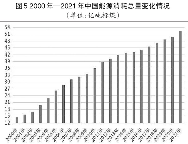 伴隨著我國工業(yè)化進程的加快,2015年后我國能源需求及消耗總量逐年增加。國家統(tǒng)計局數(shù)據(jù)顯示,2021年我國能源消耗折合標準煤52.40億噸,較2020年增加2.6億噸標準煤,同比增長5.2%(見圖5)。