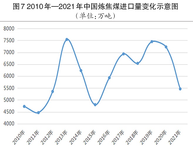 煉焦煤屬于我國較為稀缺的煤炭品種,產量并未隨原煤炭產量同比例增長。煉焦煤包括氣煤、肥煤、焦煤、瘦煤,是煤變質作用的產物。在我國煤炭資源總量中,煉焦煤占比僅略高于25%;氣煤儲量約占煉焦煤總儲量的50%左右;優(yōu)質煤種的主焦煤和肥煤合計占煉焦煤總儲量的35%左右。伴隨著我國鋼鐵工業(yè)長流程生產工藝對焦炭剛性需求的增長,我國煉焦煤需求量節(jié)節(jié)攀升。2006年前,我國還是煉焦煤的凈出口國,自2006年起,我國煉焦煤出口量大幅減少,而進口量則不斷上升至最高7500萬噸以上(見圖7)。
