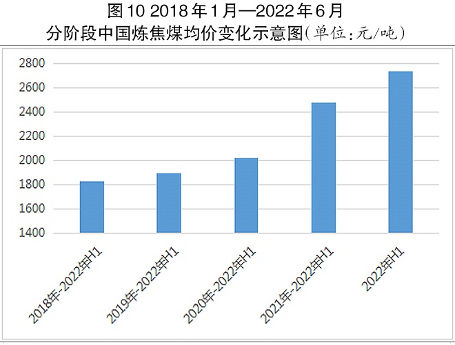 根據(jù)2018年—2022年上半年分階段統(tǒng)計的均價看(見圖10),當前煉焦煤價格處于歷史高位,但考慮到產業(yè)鏈利潤分配的合理性、產業(yè)發(fā)展的持續(xù)性,這一居高不下的價格從長遠來看不可持續(xù),未來必將在國家以及產業(yè)各方的協(xié)同努力下,逐步回歸至合理區(qū)間。