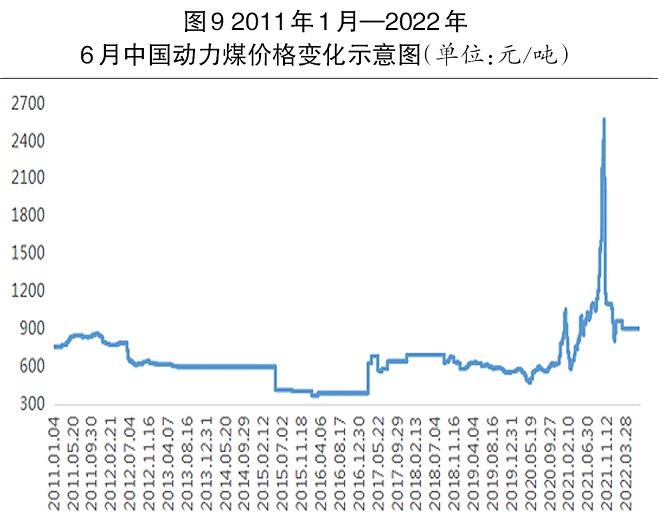 與此同時,隨著我國經濟的轉型發(fā)展和能源結構的不斷優(yōu)化,煤炭占一次能源的消費比例持續(xù)降低。國家統(tǒng)計局數(shù)據(jù)顯示(見圖6),2010年—2021年,全國煤炭消費占一次能源消費的比重由近70%下降至56%左右。但是由于我國工業(yè)化進程較短及歷史能源結構的原因,2010年—2021年煤炭始終占據(jù)著我國能源消耗總量60%以上的份額。2021年下半年后,由歐洲天然氣危機引發(fā)的能源危機波及我國,在國家相關部委出臺的政策指導下,我國煤炭產量迅速增加。