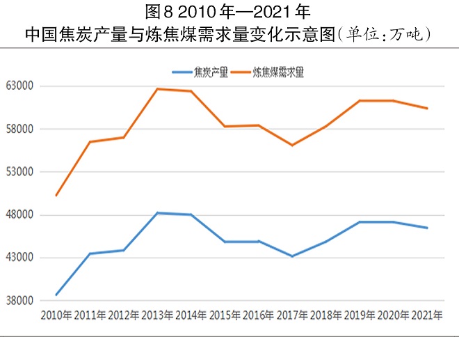根據(jù)焦炭產量推算自2010年以來我國煉焦煤的需求量(見圖8),可以看出,自2010年以來的12年時間內,我國焦炭的年均產量為4.50億噸,折合煉焦煤需求量約5.85億噸/年。近5年的焦炭年均產量為4.6億噸,折合煉焦煤需求量5.95億噸/年,而近5年的焦煤進口量為年均6700萬噸,推算的國內煉焦煤供給量平均在5.3億噸/年左右。我國煉焦煤由于自然稟賦的限制,煉焦煤的提產產能有限,因而產量提升潛力弱于動力煤。