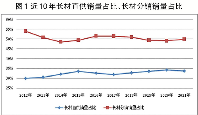 近10年長材直供銷量占比始終未超過35%。除2012年—2013年長材直供銷量占比保持在30%左右外,其他8年(2014年—2021年)長材直供銷量占比基本在33%上下波動,“波峰”為2020年的34.16%,“波谷”為2017年的31.93%。2021年長材直供銷量占比僅低于2020年,處于近10年的較高水平。