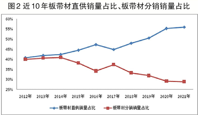 對近10年板帶材直供銷量占比、板帶材分銷銷量占比進行比較(見圖2)可知,板帶材直供銷量占比始終高于板帶材分銷銷量占比。2012年—2014年二者相差2個百分點以內(nèi);此后7年,二者差值基本呈擴大態(tài)勢(僅2017年有所縮小),2021年二者差值擴大至27.09個百分點。上述情況表明板帶材直供屬性日益突出,本質(zhì)是鋼鐵企業(yè)與終端用戶的聯(lián)系日益緊密。