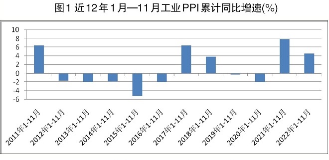 工業(yè)PPI累計(jì)同比增速基本走勢(shì)。2020年1月起,國統(tǒng)局按月發(fā)布32個(gè)大類工業(yè)行業(yè)PPI累計(jì)同比情況。2022年1月—11月份工業(yè)PPI累計(jì)同比增長4.5%,在近12年中僅低于2011年、2017年、2021年同期(見圖1)。鑒于2021年1月—11月份工業(yè)PPI累計(jì)同比增長7.9%,是近12年中的最高值,由此可判定2022年P(guān)PI累計(jì)同比增速在2021年大幅增長的基礎(chǔ)上,又保持了較高增長。據(jù)此推算,2022年1月—11月份工業(yè)PPI較2019年同期大幅增長了10.61%,較2020年同期大幅增長了12.86%。據(jù)此可判定2022年工業(yè)品出廠價(jià)格處于歷史較高水平。
