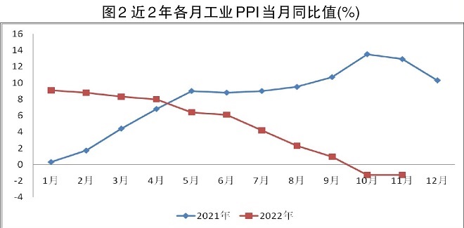 工業(yè)PPI當(dāng)月同比值基本走勢(shì)。2022年前9個(gè)工業(yè)PPI當(dāng)月同比值正增長,但2月—9月份各月同比增幅呈現(xiàn)逐月回落態(tài)勢(shì)(見圖2)。如2022年1月份工業(yè)PPI當(dāng)月同比值為9.1%,9月份工業(yè)PPI當(dāng)月同比值已回落至0.95%,即歷經(jīng)8個(gè)月的時(shí)間,工業(yè)PPI當(dāng)月同比值回落了8.15個(gè)百分點(diǎn);2022年10月份、11月份工業(yè)PPI當(dāng)月同比值均為-1.3%,為2021年1月以來首次連續(xù)2個(gè)月下降。但2022年10月份、11月份工業(yè)PPI同比下降,主要源于同比期(2021年10月份、11月份)PPI基數(shù)過高,2021年10月份、11月份工業(yè)PPI同比(較2020年10月份)分別大幅上漲13.5%、12.9%,在1996年以來工業(yè)PPI當(dāng)月同比漲幅排序中居前2位。