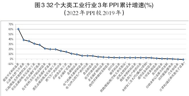 根據(jù)國際貨幣組織(IMF)能源、石油價(jià)格指數(shù)可確認(rèn),2019年能源價(jià)格指數(shù)算術(shù)平均值為129.02,石油價(jià)格指數(shù)算術(shù)平均值為142.5。而2000年1月—2022年9月,能源價(jià)格指數(shù)算術(shù)平均值為148.58,石油價(jià)格指標(biāo)算術(shù)平均值為137.75。據(jù)此判定2019年世界能源及石油價(jià)格處于歷史中檔水平,亦可判定2019年中國煤炭及石油價(jià)格處于相對(duì)合理區(qū)間。假定2019年1月—11月份各大類工業(yè)行業(yè)PPI為基值“1”,根據(jù)各大類工業(yè)行業(yè)各年P(guān)PI累計(jì)增速可推算出各大類工業(yè)行業(yè)2022年P(guān)PI較2019年增速(簡稱3年P(guān)PI累計(jì)增速,見圖3),并據(jù)此判定非常態(tài)年份(2020—2022年)中國工業(yè)PPI的結(jié)構(gòu)性變化。