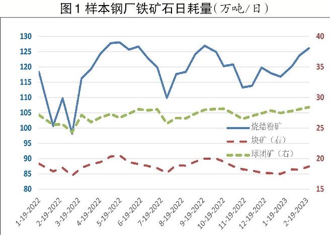 在2023年1月份的強預(yù)期下,高爐進入復(fù)產(chǎn)期,日耗量逐漸升高;至2023年2月下旬時,全國樣本鋼廠的燒結(jié)粉礦、塊礦和球團礦日耗量共達到173.26萬噸,同比增加近20萬噸,增幅12.0%,已趨近于2022年峰值。