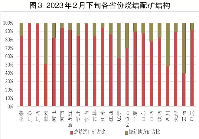 圖3所示為2023年2月下旬調(diào)研樣本所在省份的燒結(jié)配礦結(jié)構(gòu)。由此可見,廣東省的燒結(jié)配礦中100%皆為進口礦,廣西和湖南的燒結(jié)粉礦中進口礦占比也達到99%,高度依賴進口礦。而云南、四川和貴州地處西南腹地,其地方礦占比在50%~60%;遼寧的地方礦占比也達到42%;其他多數(shù)省份地方礦占比在5%~20%。全國各省份地方礦平均占比16%。