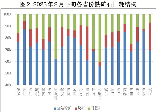 樣本鋼廠所在省份鐵礦石日耗種類結(jié)構(gòu)。圖2所示為2月下旬調(diào)研樣本鋼廠所在省份的鐵礦石平均日耗種類結(jié)構(gòu)。由圖可知,第一,燒結(jié)粉礦日耗占比相對較大的省份是廣東、云南和陜西,都在85%以上;占比相對較低的是內(nèi)蒙古,僅56%;其余地區(qū)都在60%~80%。全國樣本地區(qū)平均占比73%。第二,塊礦日耗占比較高的是江西,達到29%;其次是重慶,也達到23%;黑龍江的樣本鋼廠2023年2月下旬未使用塊礦,遼寧和云南樣本鋼廠塊礦日耗占比也僅為2%。樣本鋼廠塊礦日耗平均占比11%。第三,球團礦日耗占比較高的是內(nèi)蒙古和黑龍江,分別達到40%和38%;占比較低的是廣東,僅占5%。球團礦日耗平均占比16%。