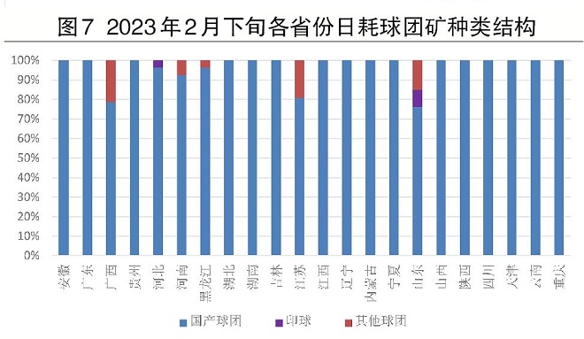 第六,2023年2月下旬,日耗球團礦的結(jié)構(gòu)同比變化相對較大,國產(chǎn)球團礦占比大幅提升,由88%提高至95%。大多地區(qū)所用球團礦幾乎都為國產(chǎn)球團礦,但山東、江蘇和廣西用了較高比例的進口球團礦(約占20%)。其中,烏克蘭球團礦日耗降為了0,印度球團礦也有小幅減少。