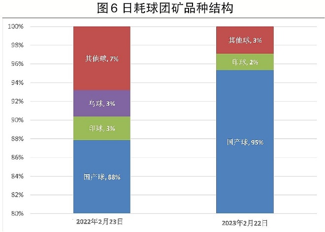 全國日耗球團礦品種結(jié)構(gòu)。圖6所示為全國2022年2月下旬和2023年2月下旬全國樣本鋼廠日耗球團礦的品種結(jié)構(gòu)??梢园l(fā)現(xiàn),日耗球團礦的結(jié)構(gòu)變化相對較大。其中,國產(chǎn)球團礦占比大幅提升,由88%提高至95%。原因主要是2022年球團廠受環(huán)保限產(chǎn)的影響,供應(yīng)受限,而今年此影響明顯減弱,供應(yīng)量明顯回升,故絕大多數(shù)球團礦實現(xiàn)了國產(chǎn)化。同時,因俄烏沖突的影響,烏克蘭球團礦無法正常生產(chǎn),今年已無進口,故其日耗占比由3%降為了0。