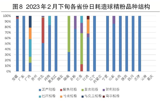 各省份日耗造球精粉品種結(jié)構(gòu)。圖8所示為2023年2月下旬,各省樣本鋼廠自產(chǎn)球團時日耗造球精粉品種結(jié)構(gòu)。由圖可見,河北、廣西和江西有自產(chǎn)球團的樣本鋼廠,所用造球精粉品種相對較多,有4種~5種,而江蘇樣本鋼廠自產(chǎn)球團時全部用進口鐵精粉,其他地區(qū)多是國產(chǎn)精粉加0~2種進口精粉。另外,貴州、湖北、內(nèi)蒙古、云南和重慶的樣本鋼廠無自產(chǎn)球團,所用皆為外購,故沒有造球精粉日耗。