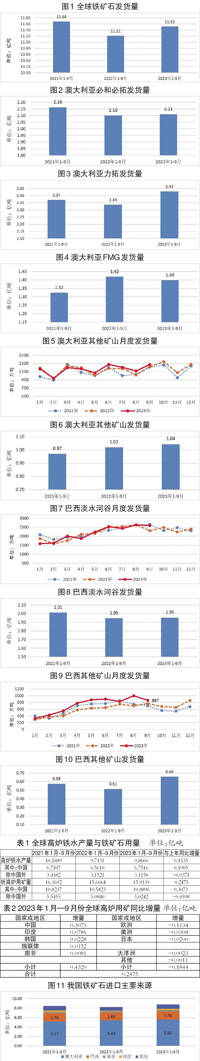 全球發(fā)貨量有所波動,發(fā)貨來源結(jié)構(gòu)變化較小。據(jù)世界鋼鐵協(xié)會數(shù)據(jù),2023年1月—9月份,全球鐵礦石累計發(fā)貨量為11.52億噸,較2022年同期增加3043萬噸,但較2021年同期減少1637萬噸(如圖1所示)。