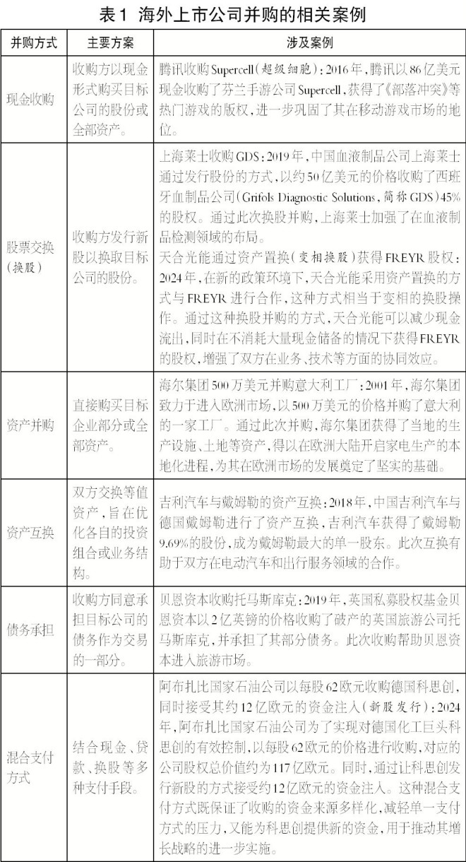 海外上市公司并購的常見方式包括現金收購、股票交換(換股)、債務承擔、資產收購、資產互換等(海外上市公司并購的相關案例見表1)?,F金收購,即以現金購買目標公司股份,迅速獲得控制權,但需大量現金流。股票交換(換股),即通過發行新股換取目標公司股份,避免大額現金支出,但可能稀釋現有股東股權。債務承擔,指收購方承擔目標公司債務,適用于負債較高但資產優質的目標公司,但會增加收購方的財務風險。資產互換是雙方交換等值資產,優化投資組合,減少現金流出?;旌现Ц斗绞絼t綜合了以上多種方式的特點,根據具體的并購需求和市場情況靈活搭配現金、股票、債務承擔、資產互換等手段,從而實現海外上市公司并購的目標。這種方式在大型復雜的跨國并購中更為常見,它可以最大限度地平衡各方利益,并提高并購成功的可能性。