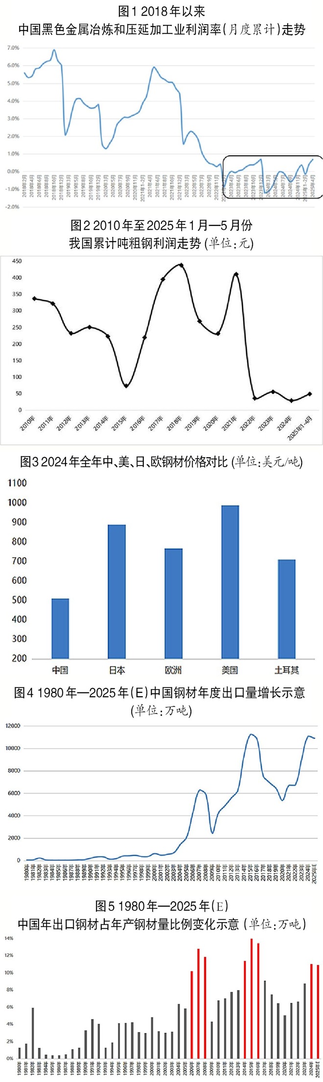 國家統(tǒng)計局?jǐn)?shù)據(jù)顯示,2025年1月—5月份的行業(yè)累計利潤率為1.0%,而這一水平已經(jīng)是自2022年7月以來的最好水平。隨著房地產(chǎn)行業(yè)對經(jīng)濟(jì)的拉動作用逐漸被新興產(chǎn)業(yè)所替代,我國鋼鐵行業(yè)整體利潤下滑嚴(yán)重。自2023年1月起,我國黑色金屬冶煉和壓延加工業(yè)整體利潤率始終圍繞著零基準(zhǔn)線上下浮動,累計利潤率由2018年的6.0%下降至2024年的0.4%。
