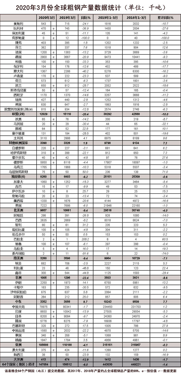 從重點國家和地區來看,3月份,中國大陸粗鋼產量為7898萬噸,同比下降1.7%;印度預估粗鋼產量為865萬噸,同比下降13.9%;日本預估粗鋼產量為820萬噸,同比下降9.7%;韓國粗鋼產量為578萬噸,同比下降7.9%。歐盟國家中,德國預估粗鋼產量為290萬噸,同比下降20.9%;意大利粗鋼產量為137萬噸,同比下降40.2%;法國預估粗鋼產量為120萬噸,同比下降13.2%;西班牙粗鋼產量為117萬噸,同比下降14.6%。美國粗鋼產量為722萬噸,同比下降6.0%。俄羅斯預估粗鋼產量為585萬噸,同比下降4.4.%;烏克蘭粗鋼產量為177萬噸,同比下降10.3%。巴西粗鋼產量為264萬噸,同比下降8.2%。土耳其粗鋼產量為311萬噸,同比提高4.1%。