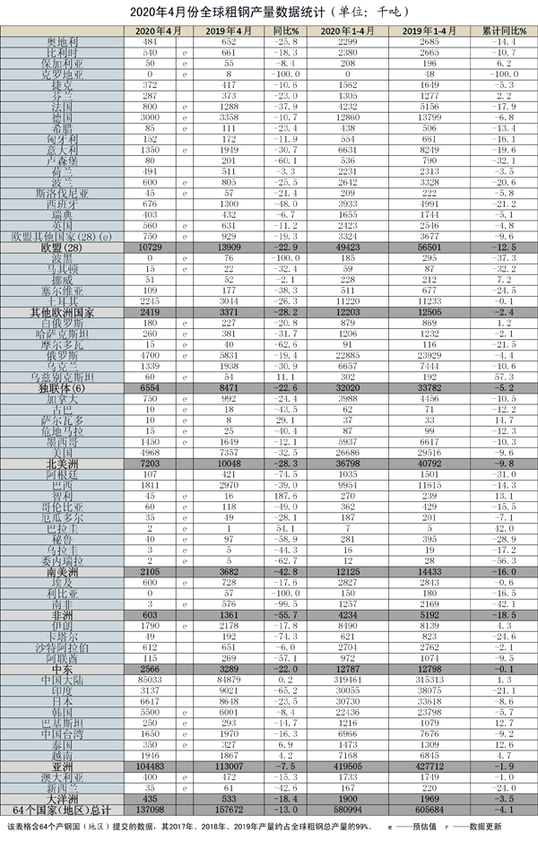 從重點國家和地區來看,4月份,中國大陸粗鋼產量為8503萬噸,同比增長0.2%;印度粗鋼產量為314萬噸,同比下降65.2%;日本粗鋼產量為662萬噸,同比下降23.5%;韓國預估粗鋼產量為550萬噸,同比下降8.4%。歐盟國家中,德國預估粗鋼產量為300萬噸,同比下降10.7%;意大利粗鋼產量為135萬噸,同比下降30.7%;法國預估粗鋼產量為80萬噸,同比下降37.9%;西班牙粗鋼產量為67.6萬噸,同比下降48.0%。美國粗鋼產量為497萬噸,同比下降32.5%。俄羅斯預估粗鋼產量為470萬噸,同比下降19.4%;烏克蘭粗鋼產量為134萬噸,同比下降30.9%。巴西粗鋼產量為181萬噸,同比下降39.0%。土耳其粗鋼產量為225萬噸,同比下降26.3%。