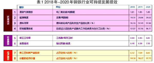 世界鋼協通過收集會員企業相關數據,系統地衡量了鋼鐵行業的經濟、環境和社會可持續發展績效(如表1)。據了解,此次共有94家鋼鐵企業和協會向世界鋼協提供了2018年~2020年相關數據(參與統計的企業粗鋼總產量略高于10億噸,占全球粗鋼總產量的53.7%)。