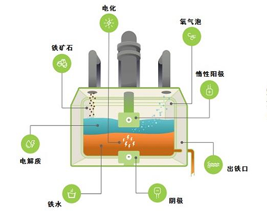 熔融鐵礦石電解煉鐵技術中的電解工藝圖例。 (圖片來源于波士頓金屬公司官網(wǎng))