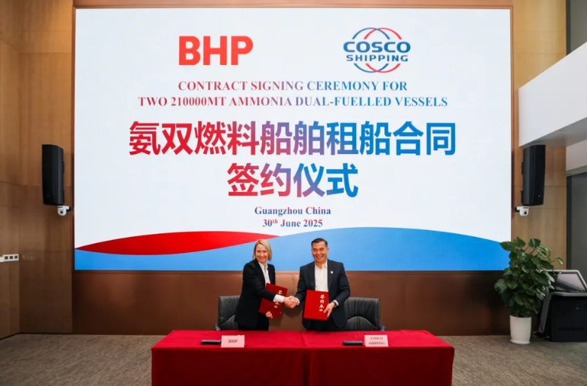 中遠海運集團副總裁林戟表示:“中遠海運與必和必拓的合作可以追溯多年。作為全球礦產資源與航運領域的杰出代表,雙方始終秉持著‘互利共贏’的理念,攜手面對行業挑戰,共同推動供應鏈效率提升與凈零排放轉型。今天我們簽署的這兩艘21萬噸氨燃料雙燃料散貨船合同,不僅是雙方合作與時俱進、攜手推動替代船用燃料的重要成果,更是‘澳大利亞-中國綠色航運走廊’建設的又一標志性實踐。氨是最具潛力的零碳船用燃料之一,此次船型的落地,是全球散貨航運領域向零碳邁進的重要里程碑。它不僅代表著技術和環保的雙重突破,也彰顯了我們對堅定支持全球氣候行動、實現中國雙碳目標的擔當與信心。”