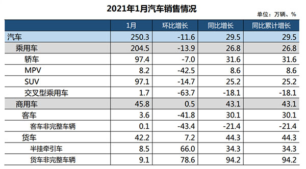 1月,汽車產銷分別完成238.8萬輛和250.3萬輛,環比分別下降15.9%和11.6%,同比分別增長34.6%和29.5%。
