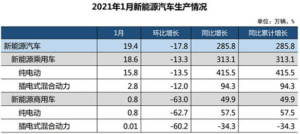 1月,新能源汽車產銷分別完成19.4萬輛和17.9萬輛,環比分別下降17.8%和27.8%,同比分別增長285.8%和238.5%。新能源汽車繼續刷新單月銷量歷史記錄,目前已連續7個月。
