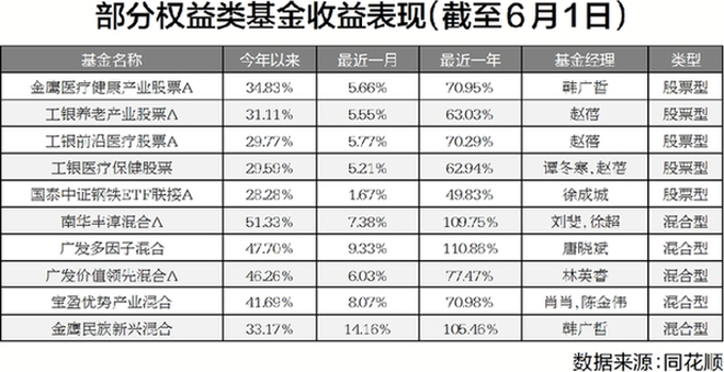 從行業來看,醫藥主題基金占據股票型基金收益榜前列。同花順數據顯示,韓廣哲管理的金鷹醫療健康產業股票A今年以來的收益率為34.83%,位居股票型基金業績榜首;趙蓓管理的工銀養老產業股票A和工銀前沿醫療股票A收益率緊隨其后,分別為31.11%和29.77%。此外,部分鋼鐵指數基金業績排名同樣居前。實際上,今年以來,已有35只股票型基金、96只混合型基金收益率超過20%。