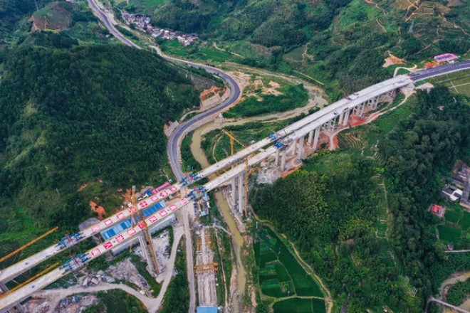 建設(shè)中的書洋特大橋(8月23日攝,無人機(jī)照片)。 8月24日,由中鐵十六局集團(tuán)承建漳(州)武(平)高速公路重難點(diǎn)及控制性工程——書洋特大橋主橋順利合龍,該橋是全線首座合龍的大跨度橋梁。書洋特大橋采用雙向四車道高速公路標(biāo)準(zhǔn),設(shè)計(jì)時(shí)速100公里,全長1074米,主墩高86米。 新華社發(fā)(許鵬健 攝)