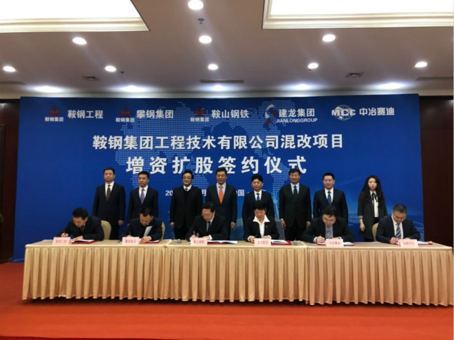 鞍山鋼鐵副總經理劉杰,攀鋼集團總經理、黨委副書記謝俊勇,鞍鋼工程發展公司總經理、黨委副書記劉文勝,北京建龍重工集團副總裁黃丹,中冶賽迪集團黨委副書記、總經理肖鵬,員工股權激勵持股平臺代表馮占立分別代表各方在增資擴股協議上簽字。鞍鋼集團黨委常委、副總經理王義棟,中冶賽迪集團黨委書記、董事長肖學文、建龍集團總裁助理張馨予等參股方代表見證了簽約儀式。