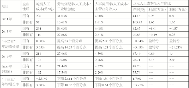 表8數(shù)據(jù)顯示,1.“十二五”國有企業(yè)、非國有企業(yè)噸鋼人工成本均有所提高,國有企業(yè)噸鋼人工成本增幅小于非國有企業(yè),但2015年國有企業(yè)每噸鋼仍比非國有企業(yè)多花費(fèi)124元人工成本。國有、非國有企業(yè)勞動(dòng)分配率、人事費(fèi)用率也均有所提高,兩類企業(yè)人力資本競爭力均有所下降。2.“十三五”國有企業(yè)噸鋼人工成本下降了2.50%,非國有企業(yè)噸鋼人工成本則繼續(xù)上升了3.88%。兩類企業(yè)的噸鋼人工成本差距從“十二五”末的124元下降到2020年(預(yù)測)的73元,噸鋼人工成本差距縮小51元。兩類企業(yè)的勞動(dòng)分配率、人事費(fèi)用率均明顯下降,國有企業(yè)降幅更大,但仍高于非國有企業(yè),兩者差距明顯縮小。這說明“十三五”兩類企業(yè)人力資本競爭力都顯著提升。
