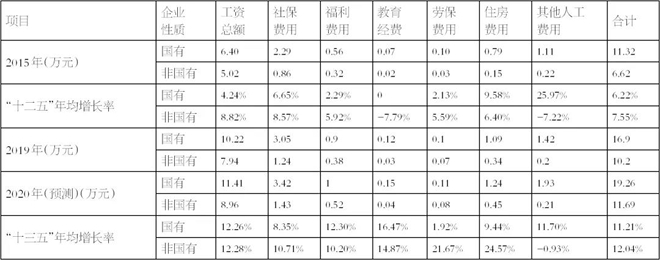 表6數(shù)據(jù)顯示,無論是“十二五”期間還是“十三五”期間,國有企業(yè)人工成本總體上仍高于非國有企業(yè)。但非國有企業(yè)人工成本增幅均大于國有企業(yè),兩者差距逐步縮小。