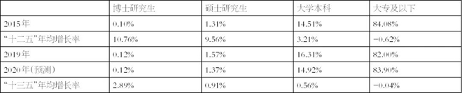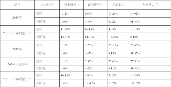 表12數(shù)據(jù)顯示,一直以來,國有企業(yè)職工學(xué)歷結(jié)構(gòu)明顯優(yōu)于非國有企業(yè),國有企業(yè)人才沉淀相對雄厚。“十二五”期間,國有企業(yè)員工中博士研究生、碩士研究生、大學(xué)本科學(xué)歷年均增速分別為11.38%、10.15%、4.95%,碩士研究生及以上學(xué)歷保持了兩位數(shù)的增速;非國有企業(yè)員工中博士研究生、碩士研究生、大學(xué)本科、大專及以下學(xué)歷年均增速分別為14.87%、14.87%、-1.68%、0.10%,非國有企業(yè)在引進(jìn)碩士研究生及以上學(xué)歷人才方面明顯加快了步伐,且增幅超過國有企業(yè),高端人才與國有企業(yè)差距明顯縮小。“十三五”期間,國有企業(yè)學(xué)歷結(jié)構(gòu)持續(xù)優(yōu)化,非國有企業(yè)學(xué)歷結(jié)構(gòu)變化不明顯。