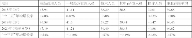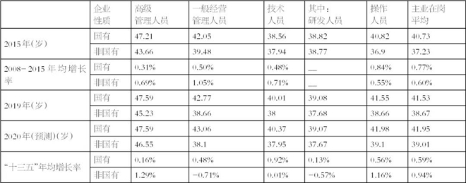 表10數(shù)據(jù)顯示,1.國有企業(yè)各類型崗位員工的平均年齡普遍大于非國有企業(yè),這與國有企業(yè)成立時(shí)間長,職工隊(duì)伍相對老齡化相關(guān)。2.從平均年齡增幅看,2008年~2015年國有企業(yè)平均年齡年增長0.77%,大于非國有企業(yè)0.60%的年增幅。“十三五”以來,國有企業(yè)注重加強(qiáng)人才引進(jìn),防止人才斷檔,其平均年齡年均增幅為0.59%,明顯小于非國有企業(yè)0.94%的年均增幅。3.國有企業(yè)、非國有企業(yè)研發(fā)人員平均年齡差距較小,且“十三五”非國有企業(yè)研發(fā)人員平均年齡呈下降趨勢,說明國有、非國有企業(yè)均重視研發(fā)人員的引進(jìn),非國有企業(yè)因產(chǎn)品升級、環(huán)保改造、產(chǎn)能擴(kuò)張等因素,進(jìn)一步加大了科技人才投入力度。