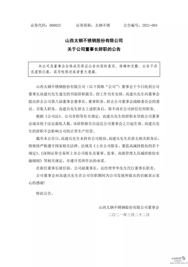 3月23日,太鋼不銹發布《關于公司董事長辭職的公告 》(以下簡稱“《公告》”)。
