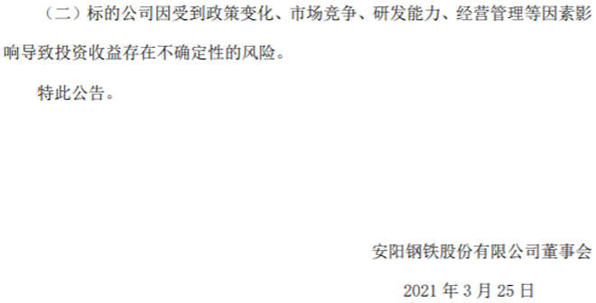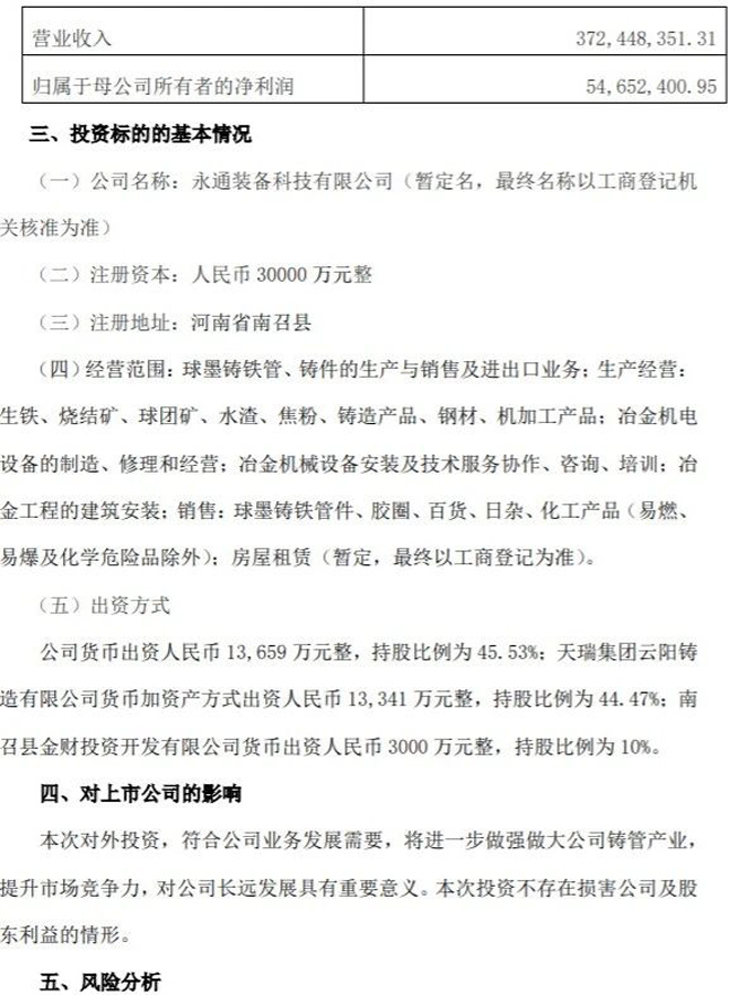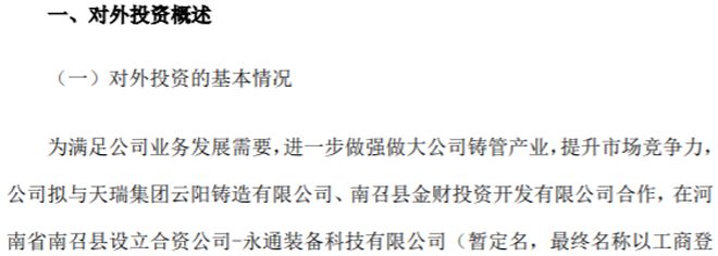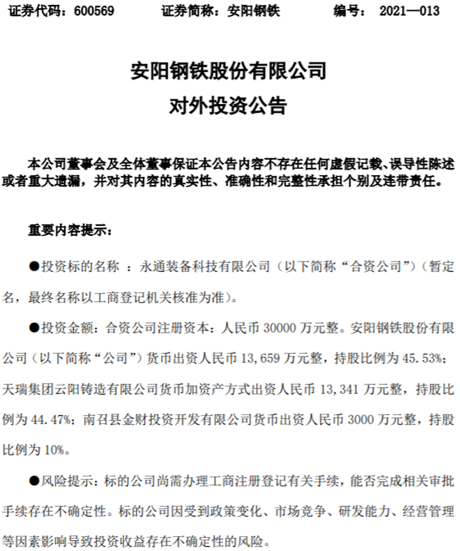 3月26日,安陽鋼鐵發布公告稱,該公司擬與天瑞集團云陽鑄造有限公司、南召縣金財投資開發有限公司合作,在河南省南召縣設立合資公司——永通裝備科技有限公司。合資公司注冊資本3億元。安陽鋼鐵貨幣出資1.37億元,持股比例45.53%。公告表示,此次對外投資,將進一步做強做大安陽鋼鐵鑄管產業。