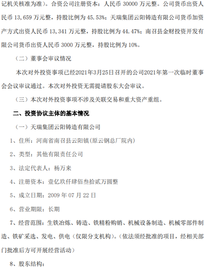 資料顯示,天瑞集團云陽鑄造有限公司,原屬天瑞集團全資子公司,注冊資金1.94億元。2020年6月份,天瑞集團已與安鋼集團、南召縣人民政府簽訂戰略合作協議,三方共同出資建設云鑄70萬噸高端鑄造項目。