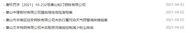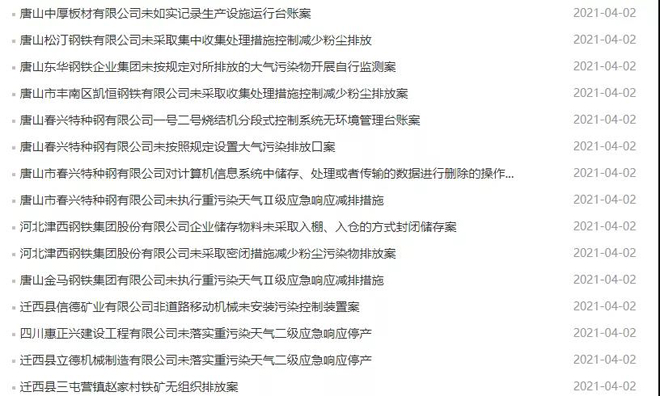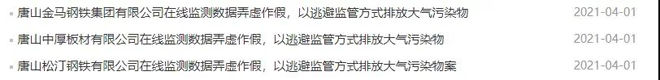 其中唐山中厚板有限公司共計收到罰單11張,處罰金額累計587萬元;唐山金馬鋼鐵集團有限公司、唐山中厚板材有限公司、唐山松汀鋼鐵有限公司等企業因在線監測造假被吊銷排污許可證、責令停業。