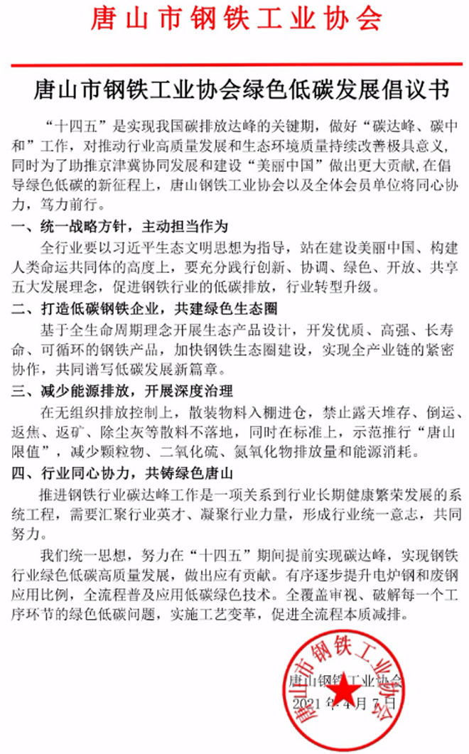 4月9日,《唐山市鋼鐵工業協會綠色低碳發展倡議書》發布,努力在“十四五”期間提前實現碳達峰,實現鋼鐵行業綠色低碳高質量發展,做出應有貢獻。