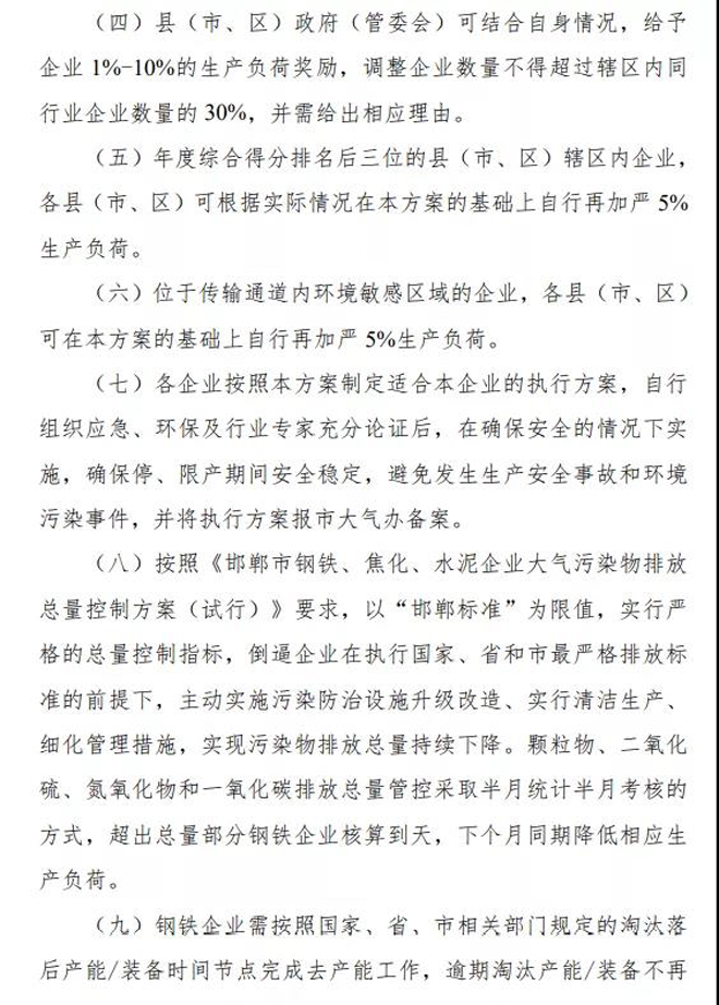 對全市鋼鐵(含獨立球團)、焦化、磚瓦(矸石磚)、巖棉、水泥(含粉磨站)、鑄造、炭素、石灰和氧化鋅等重點行業(yè)進行綠色績效評估,根據(jù)評級結(jié)果,分行業(yè)、分區(qū)域、分企業(yè)、分設備制定生產(chǎn)調(diào)控措施,明確生產(chǎn)負荷,落實到具體期限和生產(chǎn)裝備,確保完成年度治理任務,大氣環(huán)境質(zhì)量得到改善。玻璃、陶瓷等重點行業(yè)不進行績效評估,根據(jù)排污總量許可和超低排放水平確定生產(chǎn)負荷。