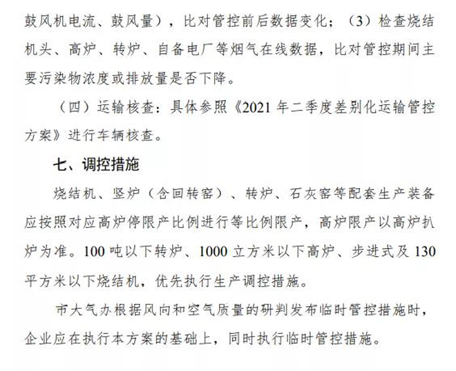 4月21日,河北省邯鄲市發(fā)布《邯鄲市2021年二季度重點行業(yè)生產(chǎn)調(diào)控方案》,對全市鋼鐵(含獨立球團)、焦化等重點行業(yè)進行綠色績效評估,根據(jù)評級結(jié)果,分行業(yè)、分區(qū)域、分企業(yè)、分設備制定生產(chǎn)調(diào)控措施,明確生產(chǎn)負荷,落實到具體期限和生產(chǎn)裝備,確保完成年度治理任務,大氣環(huán)境質(zhì)量得到改善。該生產(chǎn)調(diào)控方案執(zhí)行時間為2021年4月21日至2021年6月30日。