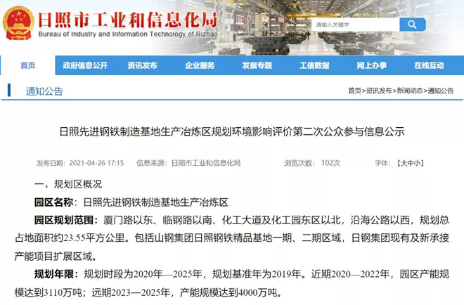 近日,日照市工業和信息化局發布《日照先進鋼鐵制造基地生產冶煉區規劃環境影響評價第二次公眾參與信息公示》,規劃建設日照先進鋼鐵制造基地生產冶煉區,規劃時段為2020年—2025年,規劃基準年為2019年。近期2020年—2022年,園區產能規模達到3110萬噸;遠期2023年—2025年,產能規模達到4000萬噸。