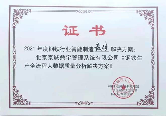 5月24日-26日,中國鋼鐵工業數字化解決方案高峰論壇在上海召開,中冶京誠鼎宇公司《鋼鐵生產全流程大數據質量分析》解決方案獲得2021年鋼鐵行業智能制造最佳解決方案。