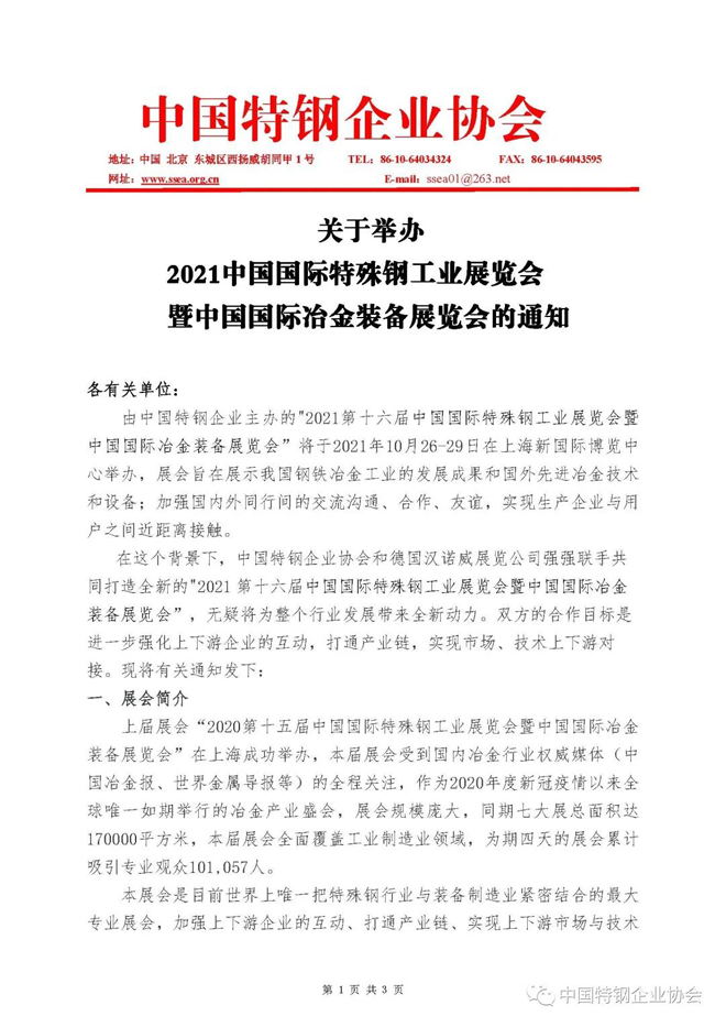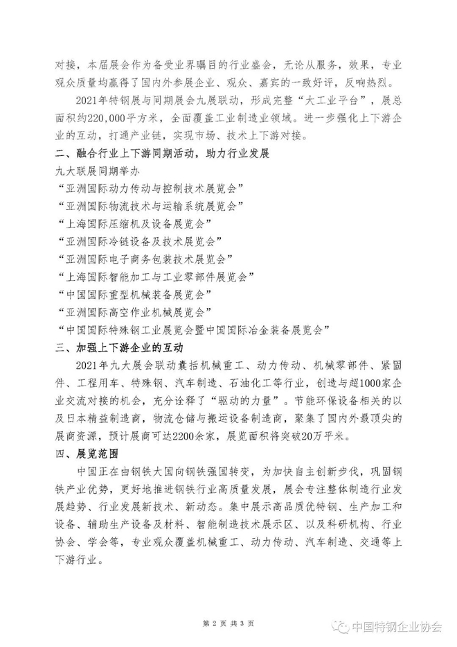 2021第十六屆中國國際特殊鋼工業(yè)展覽會(huì)暨中國國際冶金裝備展覽會(huì)將充分發(fā)揮權(quán)威展會(huì)、品牌展會(huì)的優(yōu)勢十大工業(yè)展打造的行業(yè)上下游融合大平臺(tái)幫助企業(yè)遇見了很多高質(zhì)量的精準(zhǔn)買家。