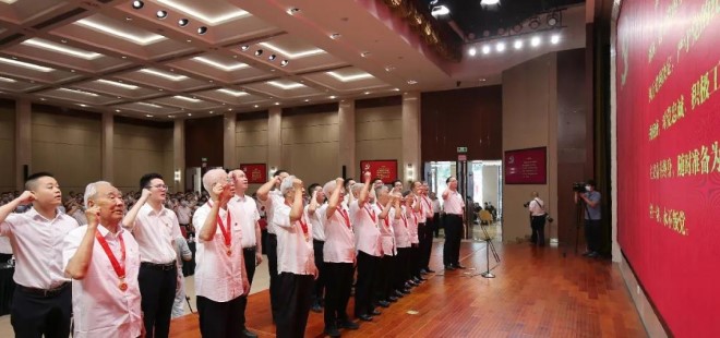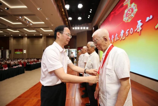 隨后,10名老黨員在經久不息的掌聲中登臺,集團公司黨委書記、董事長朱永繁一一為他們佩戴“光榮在黨50年”紀念章。這是黨中央首次為截至七一黨齡達50年、一貫表現良好的黨員頒發“光榮在黨50年”紀念章,集團公司共有547名老黨員獲此殊榮。儀式開始前,集團公司領導朱永繁、陳陽、周悅靜與老黨員代表進行了座談交流。