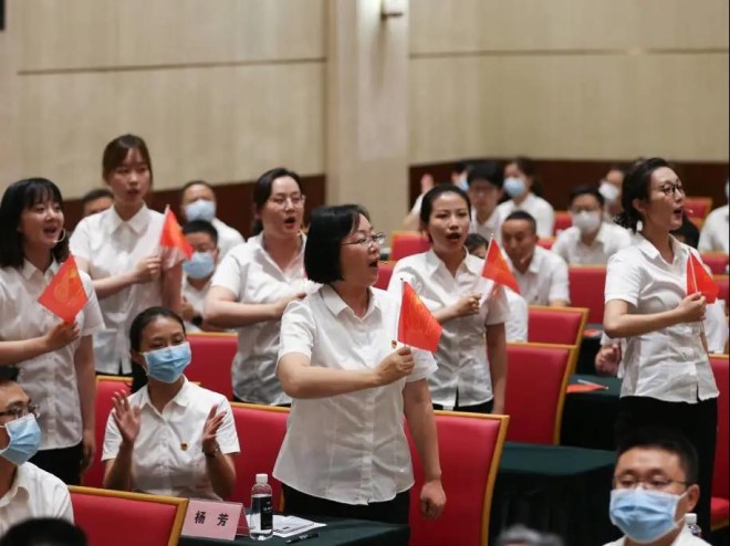 大會伊始,與會人員集體觀看了《中國共產黨百年述職報告》和《我宣誓》兩部微視頻?!栋倌晔雎殘蟾妗分販亓酥袊伯a黨極不平凡的歷程和所取得的巨大成就。《我宣誓》由集團公司黨委宣傳部攝制,五冶黨員代表傾情演繹,展現了集團全體黨員的堅定信仰和赤子情懷。兩部微視頻極具感染力和震撼力,掀起了本次紀念大會的首輪高潮。
