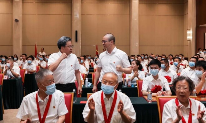 百年輝煌,薪火相傳,在全場見證下,10名新黨員走上臺,由“光榮在黨50年”的老黨員親手為他們佩戴黨徽。鮮艷閃亮的黨徽象征著理想信念的傳承,寓意著奮斗拼搏的延續,昭示著中國共產黨風華正茂,黨領導的事業生生不息。