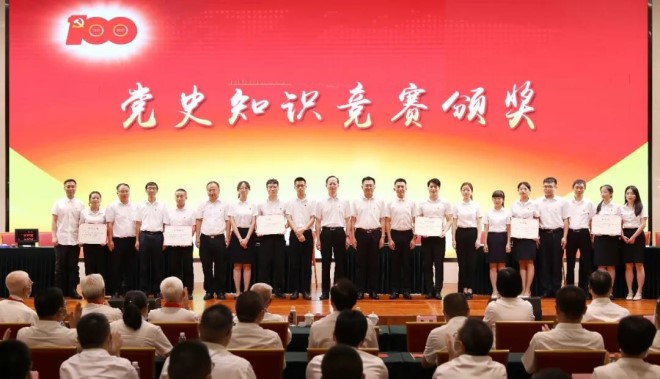 最后,大會進入黨史知識競賽決賽階段。從川滬兩地20支初賽代表隊中脫穎而出的6支代表隊展開了激烈角逐,最終集團機關代表隊榮獲一等獎,朱永繁、陳陽為參賽隊伍頒發了獲獎證書。